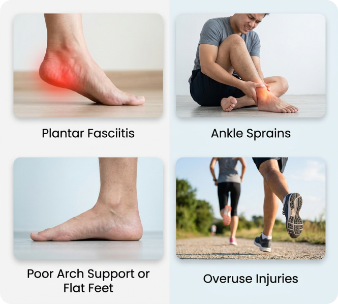 Foot and ankle pain may result from injuries, repetitive activity, arch imbalance, or conditions such as plantar fasciitis. Poor footwear and long periods of standing can also contribute to discomfort.